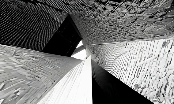 2.低角度镜头,鲜明的黑白色调,锐利的角形图案不规则地移动,创造出混乱和迷失方向的感觉。