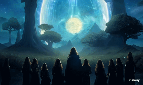 4.倾斜镜头,月光之夜,一群精灵在神圣的树林中进行仪式,发光的符文和魔法能量在他们周围旋转,古老的树木和星空,氛围神秘且敬畏。