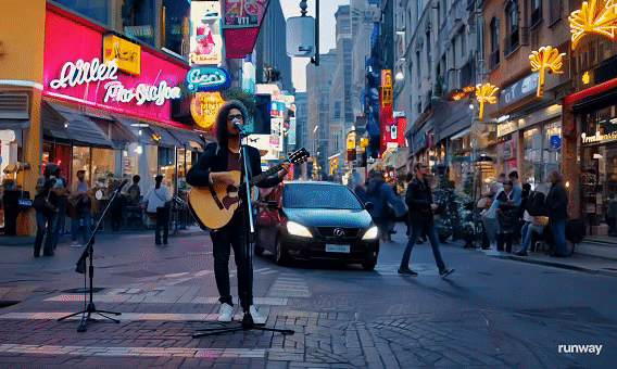 4.倾斜镜头,傍晚的街灯,一位音乐家在繁华的街角弹吉他,行人匆匆而过,商店门面上明亮的霓虹灯,氛围热闹而充满活力。