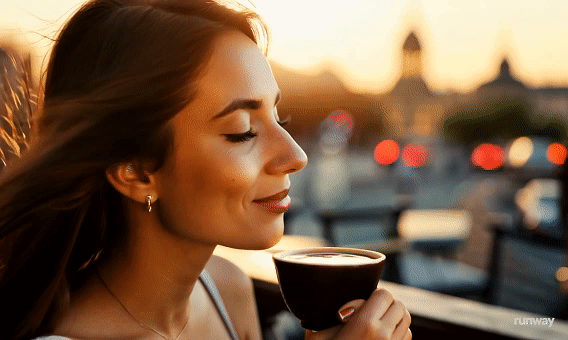 1. 特写镜头,温暖的晚霞,一位长发飘逸、面带温柔微笑的年轻女子,坐在咖啡馆的露台上,轻啜咖啡,背景中是模糊的城市景观和人群交通,氛围放松而舒适。