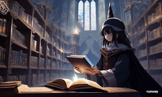 5.越肩镜头,昏暗的室内灯光,一位年轻的巫师手持魔法书,中世纪动漫风格,在宏伟的图书馆中施法,书架上摆满了古老的书籍和魔法神器,氛围神秘且魔幻。