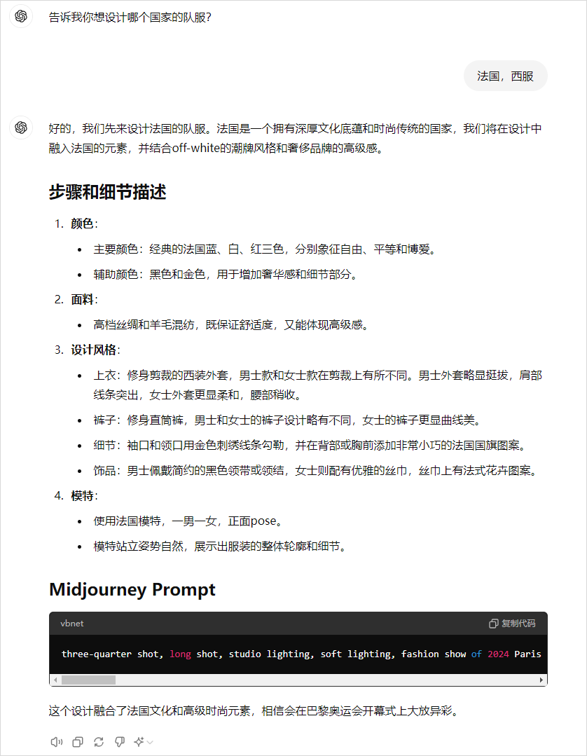 "告诉我你想设计哪个国家的队服"在回复给ChatGPT的时候,建议是:国家+款式。