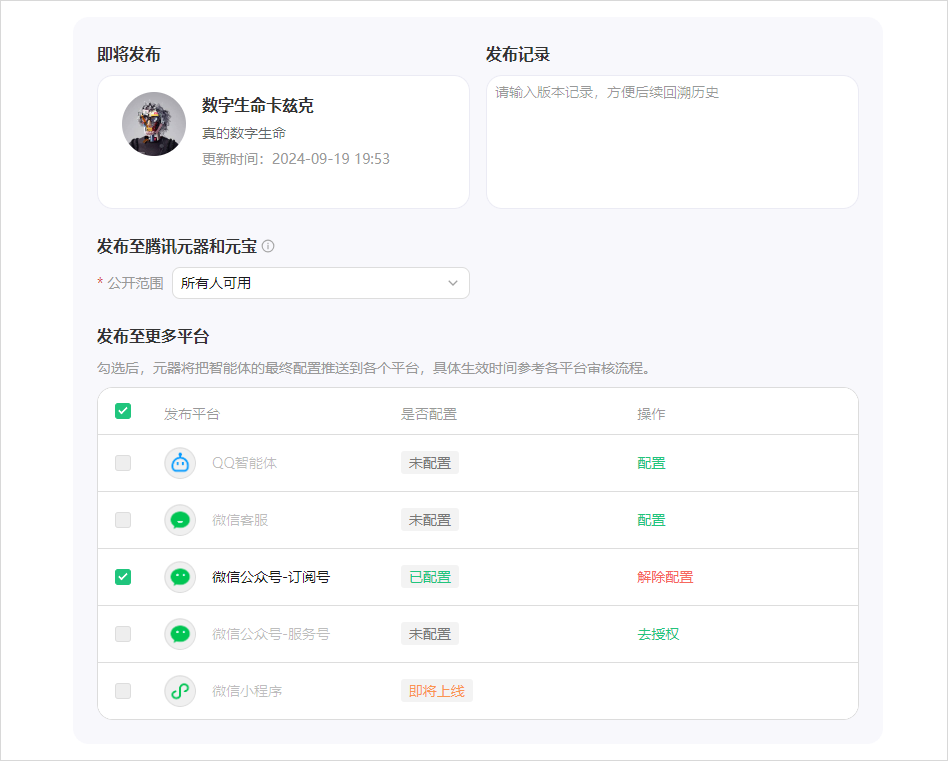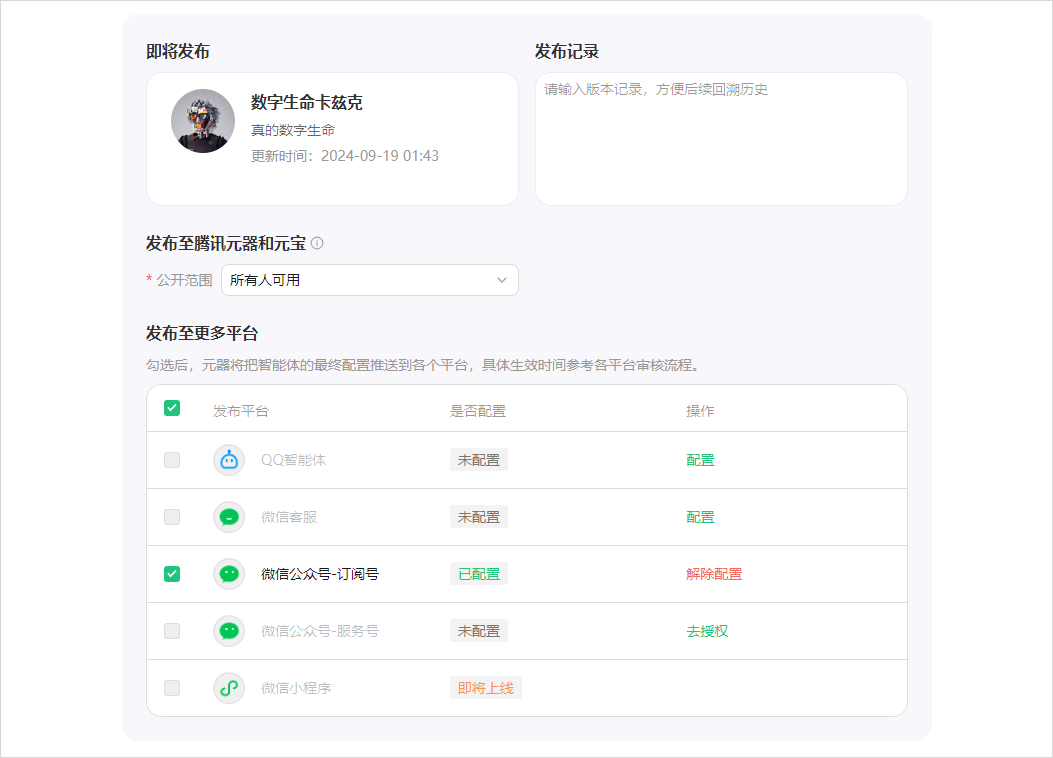 最后,点击右上角的发布,把智能体配置到你的公众号上,一切,就大功告成。