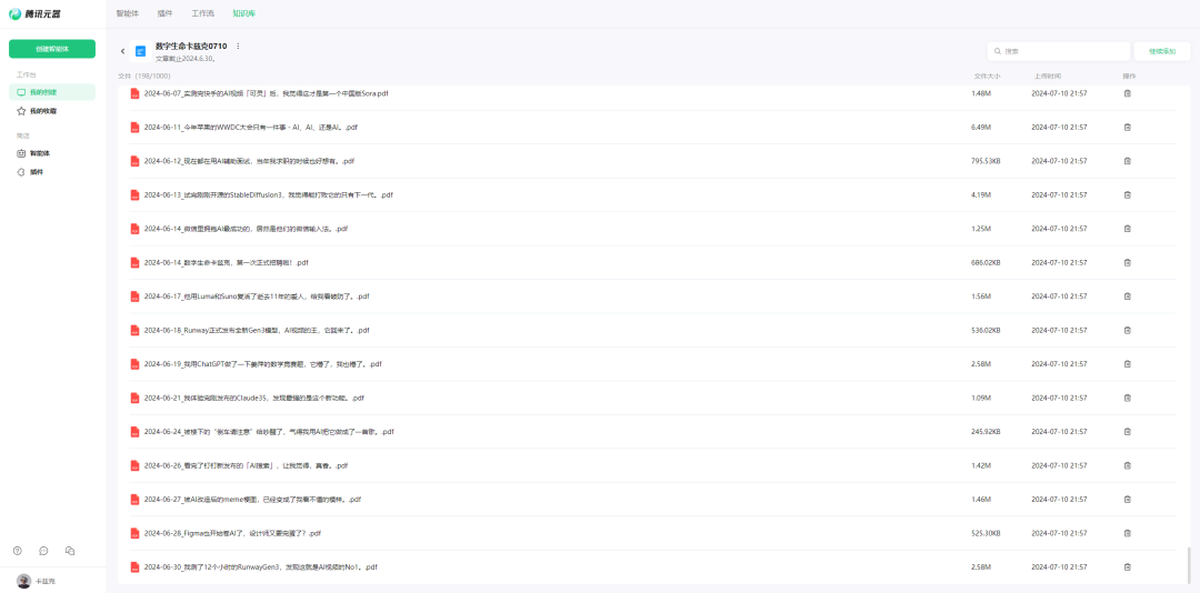 就是我发的每篇文章,我都得手动保存成word,然后传到平台的知识库上,这样问一些最新的事情,AI才会根据我的最新文章来进行回复。
