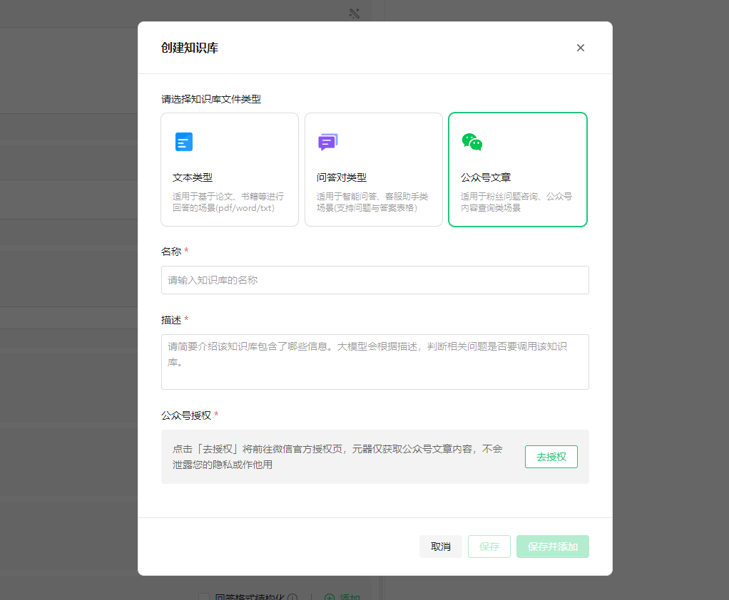 你直接点添加,创建知识库,然后选公众号文章,把那两个该填的字段填上。