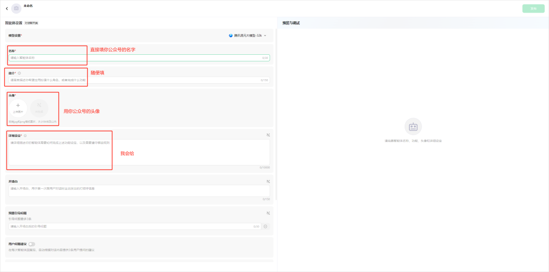智能体页面,看到一大堆要填的不要慌,都是很简单的东西。