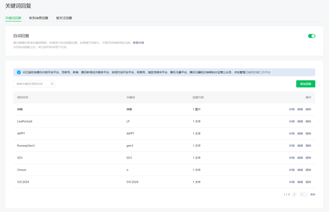 现在,你再输入任何关键词,只要你的自动回复里面设定好的,就只会触发自动回复,而不会触发AI回复。