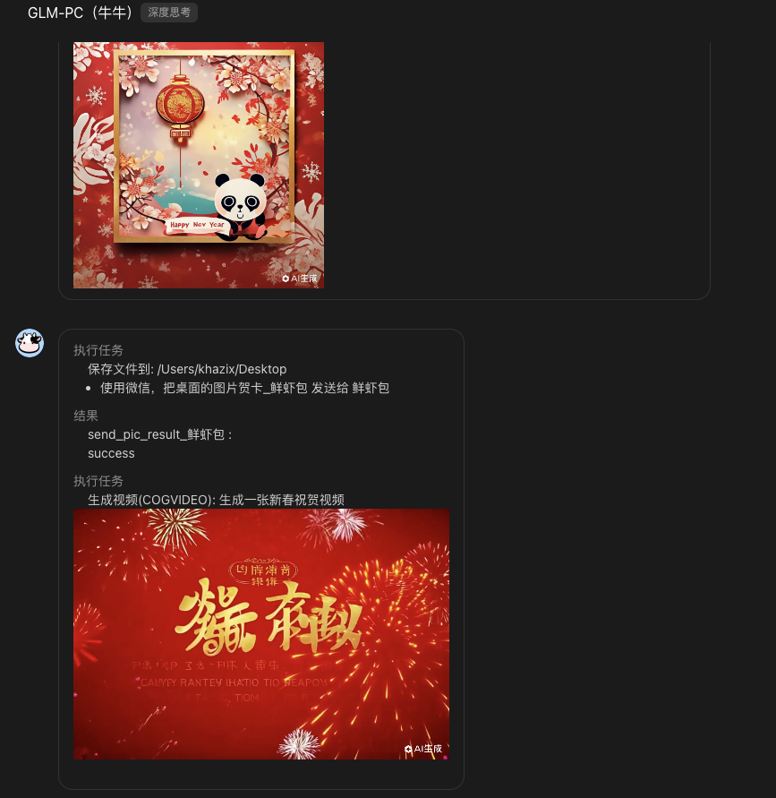 比如,我想让GLM-PC,给微信上的“鲜虾包”发送2025年新春祝福语,再给他制作一个新春图片和一个新春祝贺视频,发送给他。