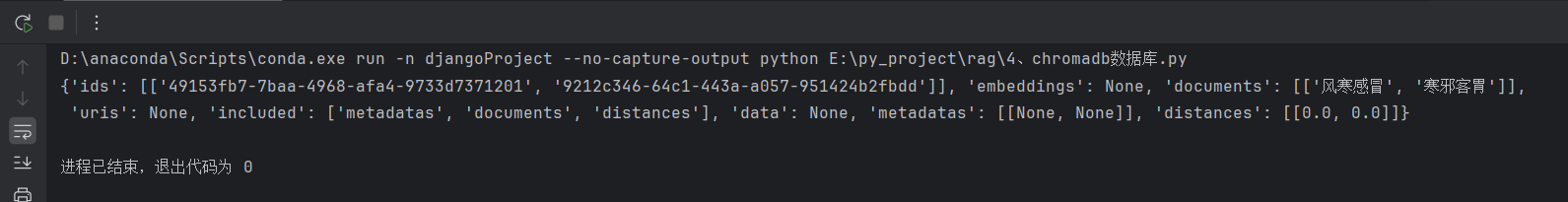 run()注意 client.delete_collection("collection_v2") 是每次存入数据前,删除上一次存入的数据,第一次运行得先注释掉,不然会报错,因为第一次数据库中并没有数据。