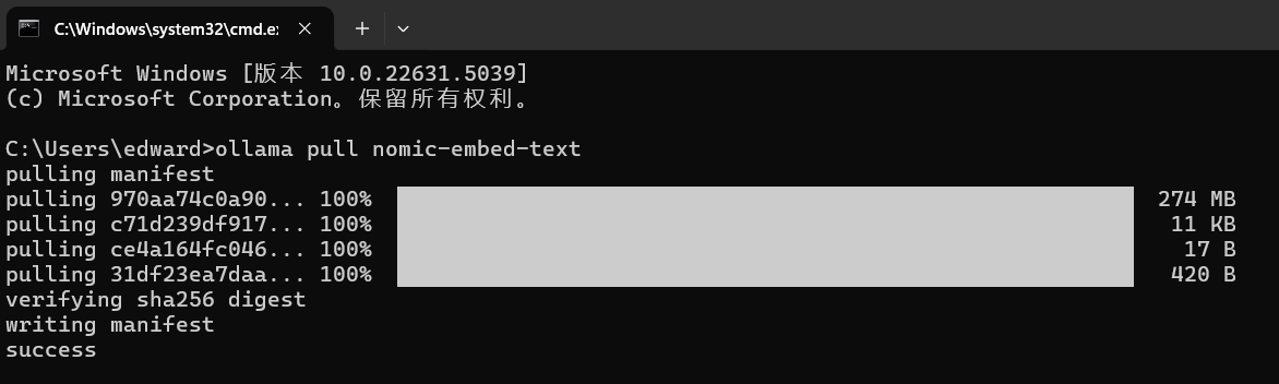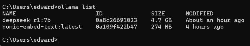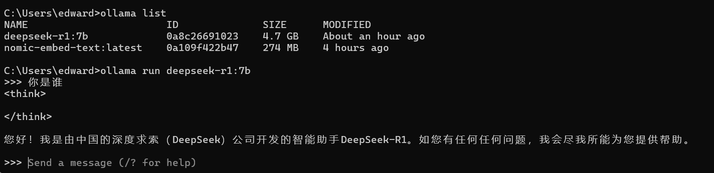下载完成后即完成本地部署,可在本地实现对话,打开 cmd ,输入 ollama list,查看 ollama 上下载的模型: