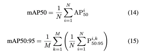 其中TP为真正例,FP为假正例,FN为假反例,N为类别总数,M为IoU阈值区间数(0.5至0.95,步长0.05,共10个区间)。