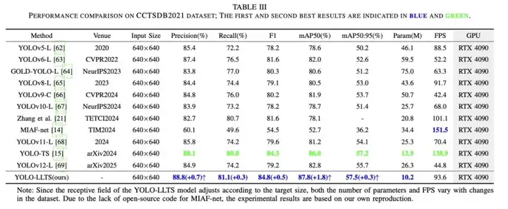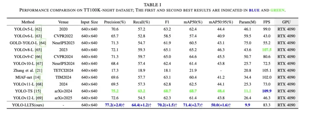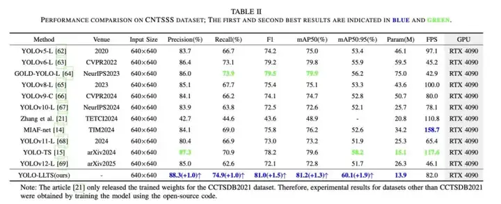 表3结果表明,在CCTSDB2021数据集上,尽管夜间训练数据占比较小,YOLO-LLTS仍以88.8%准确率(领先0.7%)、81.1%召回率(领先0.3%)及84.8 F1分数(领先0.5)全面领先。mAP50与mAP50:95分别达87.8%与57.5%,参数量10.2M时FPS高达93.6。