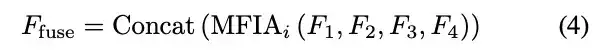该模块采用文献提出的感受野计算方法,使HRFM-TOD获得随目标尺寸自适应的动态感受野。高分辨率特征图输入至MFIA模块(MFIA1-MFIA4)进行特征融合,通过整合四个不同感受野的特征图F1F1-F4F4,在降低计算成本的同时显著增强小目标特征表征。最终特征融合公式为: