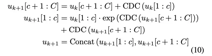 特征增强可能导致低光图像原始信息丢失,因此需要构建能够有效提取图像细节纹理的网络进行补充。可逆神经网络(INN)可提取与频域高频特征高度相关的局部信息(特别是图像边缘和线条特征)。INN通过将输入参数划分为两个部分实现输入输出特征的相互推导,这种机制可视为无损特征提取,特别适用于本应用场景。如图8所示,DTR模块通过m次INN迭代实现细节纹理的完整提取。具体实现过程为:将输入特征uk分割为uk[1:c]和uk[c+1:C]两部分,通过以下可逆计算确保细节特征的无损传输,同时为增强后的特征图提供补充: