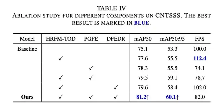 为验证各模块有效性,我们在CNTSSS数据集上以mAP50与mAP50:95为指标进行对比: