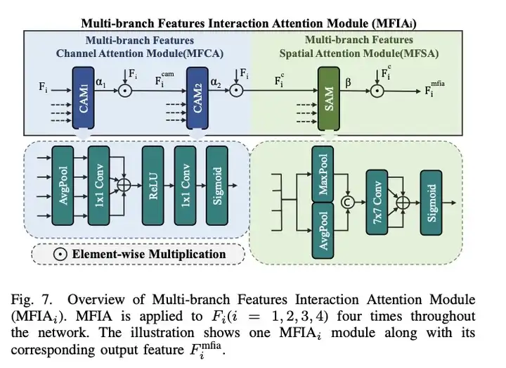 如图7所示,MFIA模块由多分支特征通道注意力(MFCA)与多分支特征空间注意力(MFSA)组成,可在通道与空间维度实现多特征高效交互。该模块在网络中被复用四次,图示展示其中一个MFIAii模块及其输出特征。