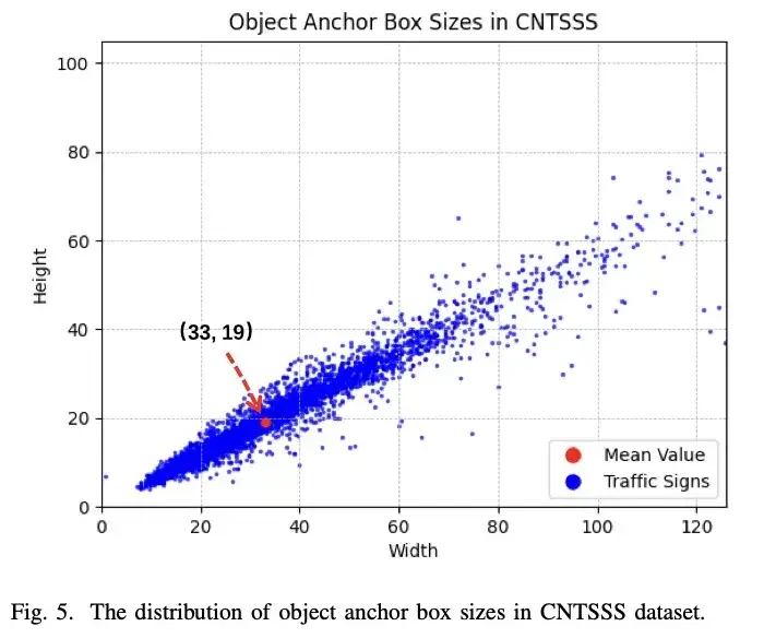 图5展示了数据集中目标锚框尺寸分布特征,每个蓝点代表交通标志的像素宽高,红点标记数据集均值(33×19像素)。分析表明本数据集中的交通标志普遍具有较小的像素占比。