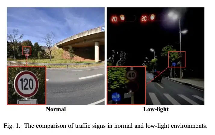 但随着夜间交通事故频发与全天候系统需求增长,低光照条件下的标志检测重要性日益凸显。如图1所示,低光环境下能见度下降与图像噪声增加导致驾驶场景复杂化。面对"小目标低分辨率"与"低光照弱可视性"的双重挑战,现有方法难以清晰捕捉标志特征进行有效检测。
