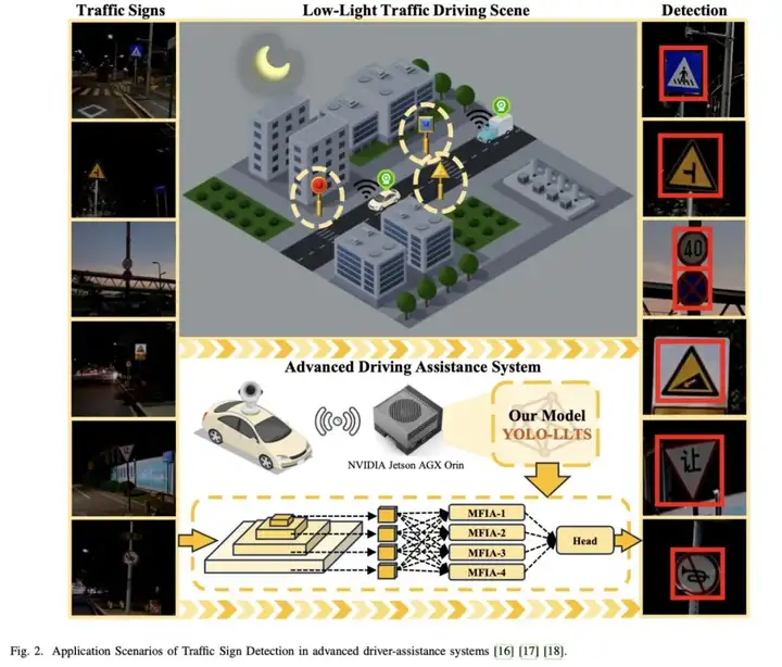 为解决低光环境下"小目标低分辨率"与"弱可视性"的双重难题,我们设计了一种专用于低光条件的端到端交通标志识别算法。如图2所示,当摄像头捕获交通标志后,搭载辅助驾驶系统的车辆通过移动边缘计算设备运行我们的YOLO-LLTS模型进行实时检测,从而保障行车安全。该算法基于YOLOv8改进,通过高分辨率图像提取清晰特征,并设计新型多分支特征交互注意力模块以融合不同感受野特征。此外,我们开发的先验引导模块不仅能增强图像,还可补充细节信息。本算法有效改善了现有方法在低光条件下的性能缺陷,提升了自动驾驶系统安全性。针对现有交通标志数据集缺乏低光场景数据的问题,我们还构建了包含黄昏至深夜多场景的中国交通标志数据集,为行业研究提供基础资源。