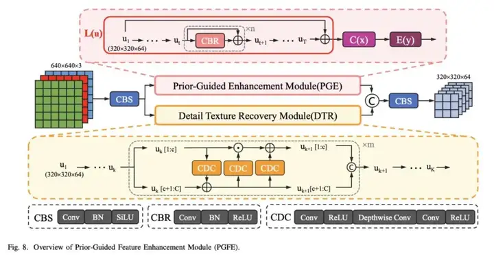 为解决这一挑战,我们提出先验引导特征增强模块(PGFE),替代YOLOv8原有的P0层。该模块将RGB图像从3通道扩展至64通道,在增强低光图像的同时为后续检测提供先验知识。模块由先验引导增强(PGE)与细节纹理恢复(DTR)两个核心组件构成。