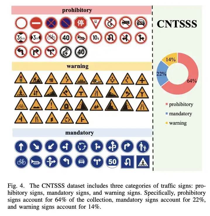 白昼数据转换无法准确评估夜间性能,因此我们构建了纯夜间采集的交通标志数据集。CNTSSS包含训练集3,276张、测试集786张图像,标志分为禁令、指示与警告三类(详见前文)。