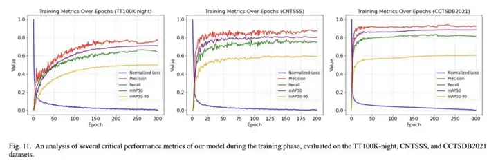 图11展示三个数据集上归一化损失、精确率等关键指标随训练轮次的变化曲线。可见归一化损失(框损失、分类损失与分布焦点损失之和)随训练快速下降并趋于稳定,其他指标亦快速收敛,表明模型具有良好的训练稳定性。