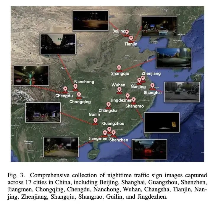为解决这一问题,我们构建了新型夜间交通标志数据集CNTSSS。如图3所示,该数据集涵盖北京、上海、广州等中国17个城市的4062张夜间交通标志图像,确保数据覆盖不同地理区域与经济水平下的城市环境。数据集按4:1比例划分为训练集(3276张,13个城市)与测试集(786张,成都/上海/深圳/天津4市)。