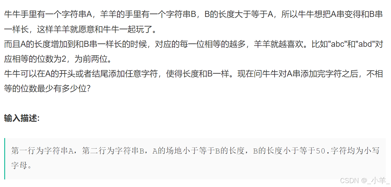 当在A的开头或结尾添加字符直到和B长度相等时,要求对应位置不相等的最少字符。因为我们总有方法保证在A的长度和B相等时,新添加的字符和B对应位置相同,所以对应位置字符不同可以只在A原始串中出现。所以只需要枚举A相对于B不同位置时的最小结果。