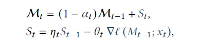 其次是记忆更新方式,这里论文采用在线学习来对记忆模块的参数进行持续更新,损失函数就是存储记忆的Key,Value之间的空间距离,而梯度更新时,Titan同时考虑到了动态遗忘机制和动量机制,其中