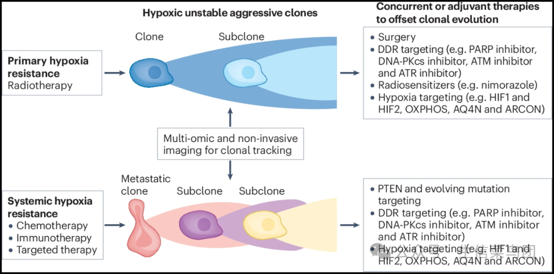 ◉ 目前局部和全身癌症治疗的成功可能受到原发或转移性肿瘤中缺氧亚区域内的不稳定缺氧克隆的限制。◉ 由于低氧条件下DNA损伤减少,缺氧限制了局部放疗的有效性,但不影响手术后的局部控制。◉ 手术和放疗的成功都将受到由缺氧驱动的微转移扩散的限制。◉ 研究表明,缺氧驱动早期克隆突变而不是亚克隆突变,并且因此,需要早期靶向和杀灭这些缺氧克隆以阻止进一步演化出抗治疗克隆。◉ 靶向缺氧细胞的策略包括使用碳氧呼吸(加速放疗与碳氧和烟酰胺结合(ARCON))进行缺氧细胞放射增敏,或者将DNA修复抑制剂与放疗结合;◉ 靶向线粒体复合物并增加O2扩散以增强辐射诱导损伤的氧化磷酸化(OXPHOS)抑制剂;◉ 如替拉帕嗪或TH-302等缺氧激活前药,在缺氧条件下被还原成其活性细胞毒性物质以选择性杀灭缺氧细胞;◉ 或者通过抑制缺氧诱导转录因子1(HIF1)或HIF2来抑制缺氧引起的HIFs激活。◉ 利用聚ADP核糖聚合酶(PARP)、共济失调毛细血管扩张突变(ATM)和共济失调毛细血管扩张RAD3相关(ATR)抑制剂靶向缺氧细胞中的基因组不稳定性和缺陷DNA损伤反应(DDR),也可能在原发和转移性疾病中提供治疗益处。◉ DNA-PKcs,DNA依赖性蛋白激酶催化亚基。