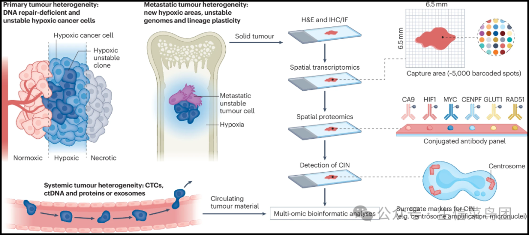 ◉ 对由于缺氧引起的肿瘤演化的研究需要解决原发和转移病灶以及循环肿瘤细胞(CTCs)中的复杂肿瘤内异质性。◉ 空间基因组学、转录组学和蛋白质组学能够对患者体内病变内的演变和病变间的演变进行建模。◉ 转录组-蛋白质组关联可以进一步与基因组不稳定性的原位标记相关联,包括全基因组测序、荧光原位杂交和染色体不稳定性(CIN)替代标记的检测(例如,中心体数量和微核)。◉ 这些技术不仅通过识别缺氧梯度来改进经典方法(如多重免疫荧光成像),还通过复合生物信息学方法帮助理解它们的生物学行为。◉ 这可能有助于开发多模式生物标志物,以增加患者在具有特定疗法的治疗臂中的分层,如图5所示。◉ 用于成像缺氧肿瘤块的非侵入性PET和功能性MRI方法补充了空间生物学成像,以便在不同治疗过程中跟踪肿瘤缺氧情况。◉ ctDNA,循环肿瘤DNA;H&E,苏木精和伊红;IF,免疫荧光;IHC,免疫组织化学。