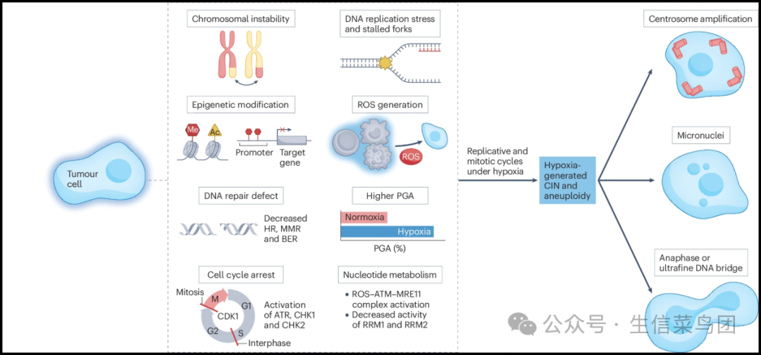 ◉ 中度至重度缺氧抑制了DNA修复途径(方框2)和DNA复制,并能在S期以及G2或M期引发细胞周期停滞。缺氧条件还扰乱了核苷酸生成和核苷酸分解的调控。在前一种情况下,缺氧通过减少核糖核苷二磷酸还原酶亚基M1(RRM1)和RRM2的活性导致可用核苷酸的短缺,驱动DNA复制压力。◉ 缺氧还通过在活跃的DNA复制过程中激活活性氧(ROS)–共济失调毛细血管扩张突变(ATM)–MRE11复合物增加突变率,因为缺氧导致新生DNA降解并在同源重组(HR)减少的情况下产生过量的ROS。◉ 更具体地说,当这种复合物的激活与缺氧细胞中的HR修复缺陷结合时,它会导致细胞使用易出错的DNA修复途径,从而导致突变率增加。◉ 暴露于缺氧环境下的存活癌细胞中的一个或多个这些过程会导致在持续的复制和有丝分裂周期中产生染色体不稳定(CIN)和非整倍体。◉ 这些在缺氧条件下的显著染色体变化可以在结构上(染色体臂的增减)和/或数量上(整个染色体拷贝数的变化;倍性)发生,并导致观察到的异常有丝分裂、中心体过度复制和扩增、微核和染色体破碎(即染色体碎裂)。