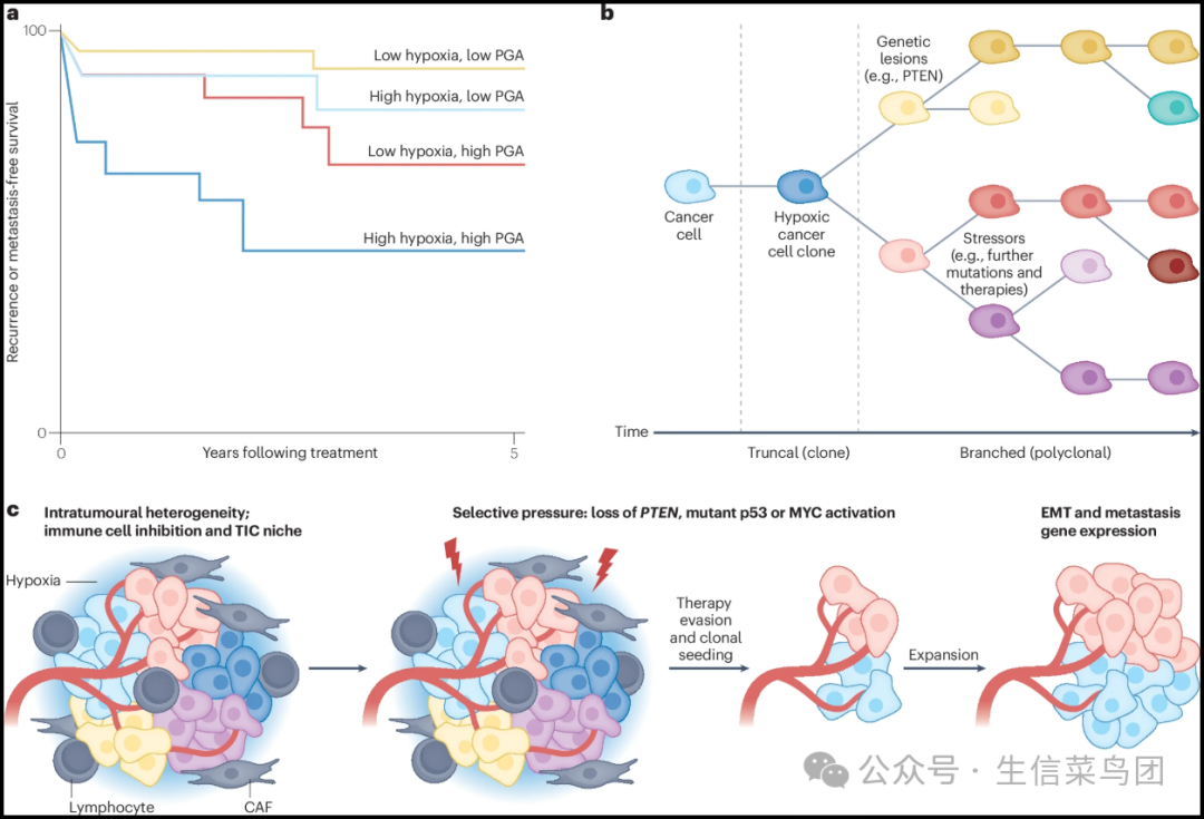 ◉ 临床研究表明,肿瘤内高缺氧(通过直接测量氧气(O2)或基于RNA的缺氧特征评分来测量)和基因组不稳定性(通过表示为基因组改变百分比(PGA)的拷贝数改变数量来测量)的结合会导致协同不良预后,相比之下,仅具有这两种因素之一或两者都不具备时预后较好。这种预后的相互作用表明缺氧不是基因组不稳定性的替代物,反之亦然。◉ 代表性的Kaplan-Meier曲线显示了前列腺癌治疗后的结果(生化无复发生存或复发;数据来自参考文献37,并在此综述中重新绘制),在肉瘤中也观察到了类似的转移无生存期结果。◉ 高缺氧与高基因组不稳定状态下生存曲线的快速下降表明存在对治疗耐药的隐匿性微转移或大转移疾病。◉ 克隆突变是所有肿瘤细胞共有的,而亚克隆突变仅存在于部分细胞中。◉ 升高的缺氧可能与不同癌症类型中的克隆或亚克隆改变相关联。◉ 在前列腺癌中,缺氧未被证明与检测到的亚克隆数量相关,这表明缺氧在这些肿瘤进化早期就对其施加了选择压力,在亚克隆多样化之前。◉ 这些和其他研究显示了肿瘤缺氧与PTEN丢失之间的关联,以预测亚克隆结构。◉ 这表明特定微环境背景下存在的突变可以驱动跨癌症类型的多克隆结构。◉ 相反,BCL2和STAT6的突变与低缺氧评分相关,表明这些基因突变的缺氧细胞具有适应性脆弱性。◉ 肿瘤内的异质性和遗传变异的多灶性存在于由血管、间充质和免疫细胞组成的多样化的肿瘤微环境中。◉ 缺氧亚区通过刺激免疫逃逸、生成肿瘤起始细胞(TICs)的生态位以及驱动上皮-间质转化(EMT)和向转移性变异的谱系可塑性,促进了这种异质性。◉ TP53、MYC和PTEN的改变在不同癌症类型中高缺氧的肿瘤中更为常见。◉ 这支持了含有驱动突变如TP53和PTEN的不稳定缺氧克隆的差异适应和选择,这些突变在低氧条件下促进细胞存活和不稳定基因组。◉ 这样的克隆对局部和全身治疗具有抵抗力。CAF,癌症相关成纤维细胞。