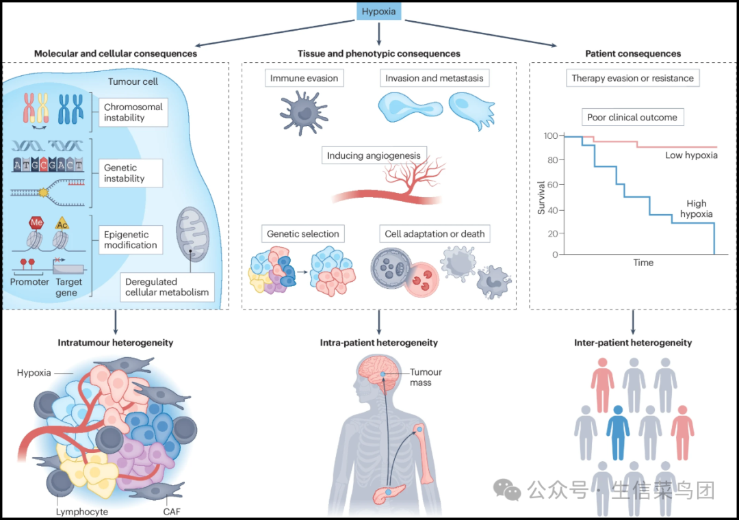 ◉ 缺氧条件会导致细胞代谢的改变,从氧化磷酸化转向糖酵解(方框 1)。肿瘤内的缺氧亚区域也引发了一系列对基因组完整性的细胞内效应(左侧)。这包括减少 DNA 修复、DNA 复制压力和核苷酸突变(方框 2)。缺氧水平的增加伴随着拷贝数变异的增加、染色体不稳定性和表观遗传修饰的增加。肿瘤微环境由多种细胞类型(免疫细胞、基质细胞和内皮细胞)组成,并且在常氧与缺氧区之间可能有所不同。◉ 动态的缺氧梯度的存在引发了一系列细胞和组织反应,包括在严酷的低氧(O2)环境中细胞适应与细胞死亡之间的平衡、变化的免疫监视、不同的血管生成和灌注以及侵袭性和转移性表型的获得(中间)。这些过程共同驱动了患者内部的异质性。在具有相似肿瘤类型的患者群体中,缺氧的存在与否将决定对局部治疗(手术或放疗)、化疗、靶向治疗和免疫治疗的相对患者间异质性(右侧)。◉ 考虑到这些各种各样的细胞、肿瘤和宿主效应,缺氧伴随着更差的临床预后并不令人惊讶,因为这是由于在适应低 O2 水平期间出现的突变和侵略性表型。CAF,癌症相关成纤维细胞。