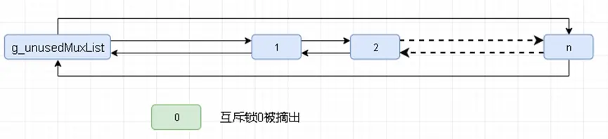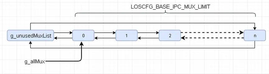 初始化时内核会申请LOSCFG_BASE_IPC_MUX_LIMIT个锁资源,并把各资源块挂载到双向环形链表g_unusedMuxList中,全局变量g_allMux指向锁资源内存首地址,后续根据首地址加ID方式快速查找对应的控制块: