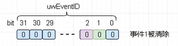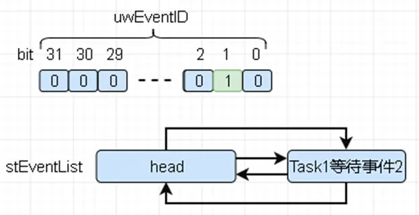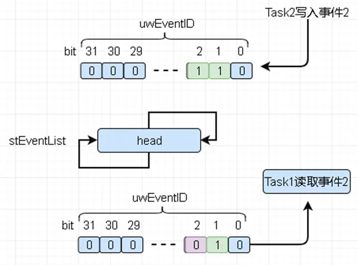 事件写:当事件2发生时,任务Task2把事件2写入uwEventID,此时任务Task1被调度读取事件成功,事件2对应bit位被清0(也可以不清0),Task1从链表stEventList中被摘出。