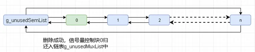 信号量删除:任务调用LOS_SemDelete()删除信号量,如果删除成功,锁资源被归还到g_unusedSemList的头部。