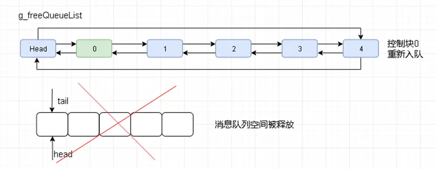 删除队列:当不再使用队列时可以使用LOS_QueueDelete()来删除队列,此时会归还队列控制块到g_freeQueueList中,并释放消息队列: