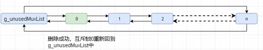 互斥锁删除:任务调用LOS_MuxDelete()删除互斥锁,如果删除成功锁资源被归还到g_unusedMuxList中。