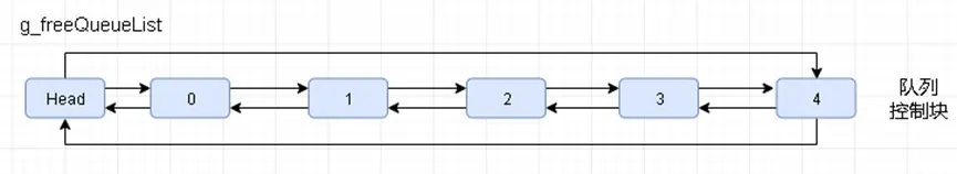 队列控制块:管理具体消息队列的数据块,内核初始化时调用OsQueueInit()创建,并依次挂载到双向环形链表g_freeQueueList中,此时控制块状态为OS_QUEUE_UNUSED,队列控制块用来保存队列的状态,队列长度、消息长度、队列ID、队列头尾位置和等待读写的任务列表,内核就是根据这些信息来管理消息队列和任务完成对消息读写等操作。