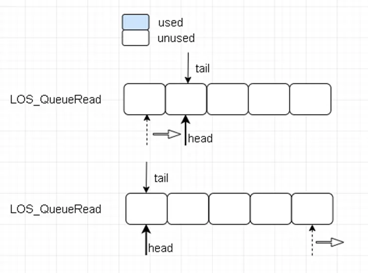 读队列:读队列只有一种方式,从队列头部读LOS_QueueRead(),读取之后head指向下个节点。