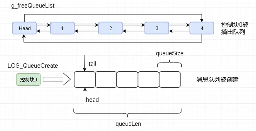 创建队列:队列用于存放具体的消息内容,任务可以调用LOS_QueueCreate()来创建队列,此时内核会根据入参指定的队列长度和消息大小申请内存创建队列,并从g_freeQueueList中分配一个控制块来管理队列,被分配的队列控制块状态为OS_QUEUE_INUSED。分配队列控制块时总是从头节点开始,如下图控制块0首先被分配用于管理新创建的队列。