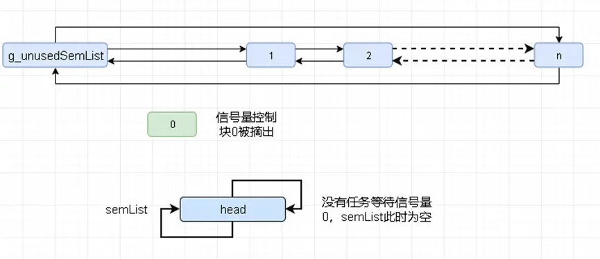 信号量创建:任务调用LOS_SemCreate()创建信号量,并指定同一时刻访问此资源的最大任务数目。内核从g_unusedSemList的头部分配一个信号量控制块并初始化。