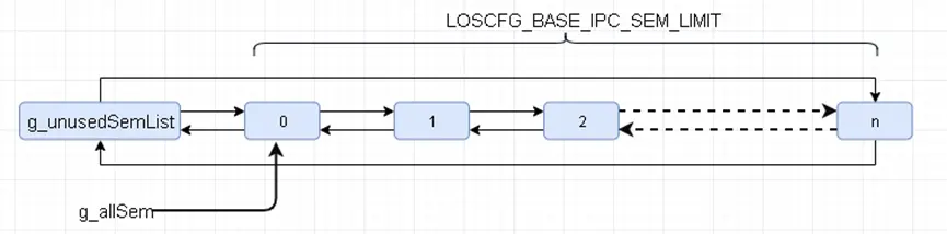 信号量控制块:信号量控制块资源由内核创建和维护,内核初始化时会调用函数OsSemInit()对信号量资源进行初始化。初始化时申请LOSCFG_BASE_IPC_SEM_LIMIT个信号量控制块,g_allSem指向信号量控制块的首地址,创建好的信号量控制块会挂载到空闲链表g_unusedSemList中。申请信号量的任务会在控制块的链表semList上排队,semCount指示可以被访问的资源数。