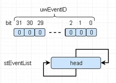 事件控制块:事件控制块用来记录事件和管理等待读取事件的任务。uwEventID总共32bit代表31个事件(bit25保留),stEventList事件控制块的双向环形链表,当有任务读取事件但事件还没发生时任务会被挂载链表中,当事件发生时系统唤醒等待事件的任务,此时任务就会被摘出链表。