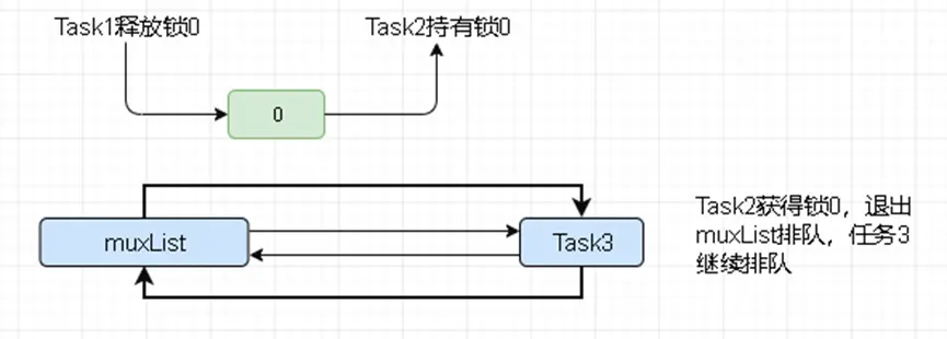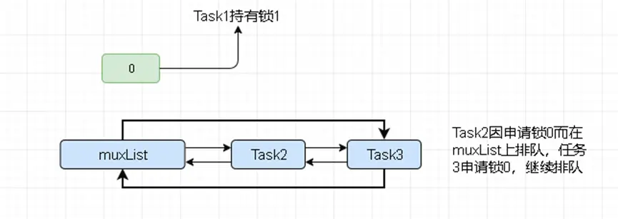 互斥锁申请:任务调用LOS_MuxPend()申请互斥锁,如果锁被其它任务持有,则任务在muxList上排队。