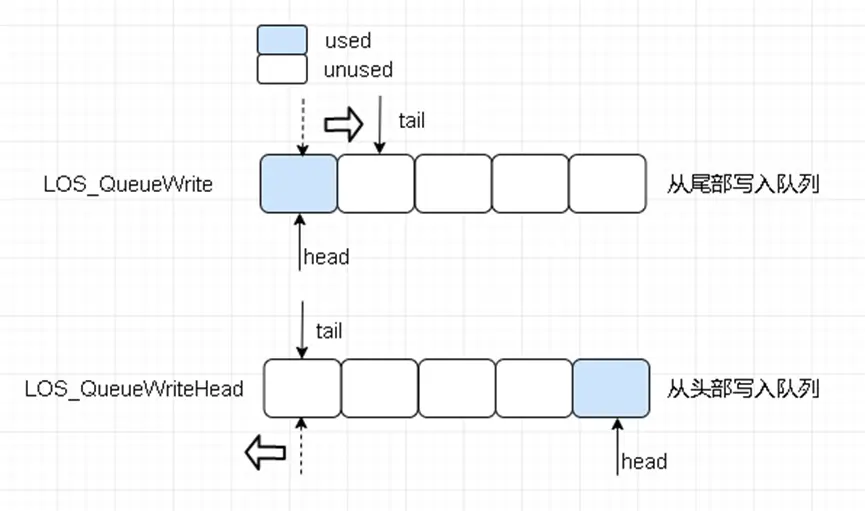 写队列:内核支持两种写队列方式:从尾部写入LOS_QueueWrite()和 从头部写入LOS_QueueWriteHead():