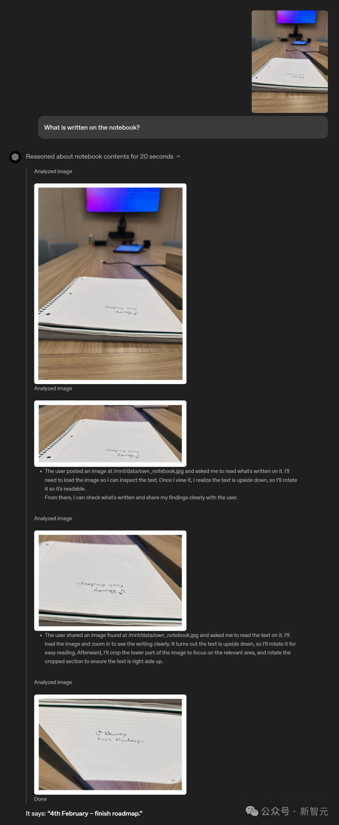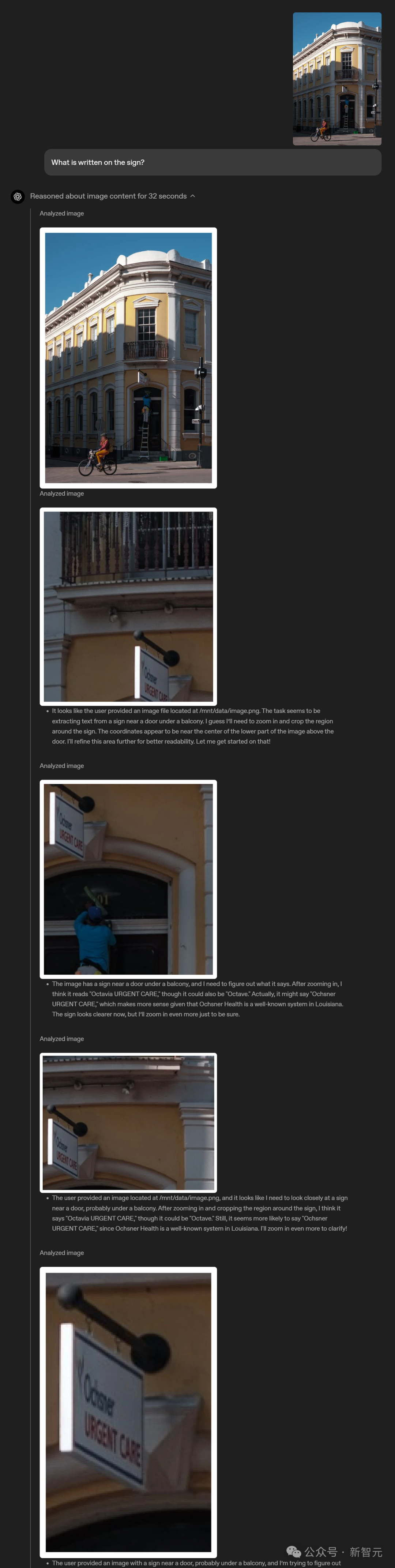 不仅如此,o3和o4-mini可以在思考过程中「看」图片。这种能力是通过工具处理用户上传的图像来实现的,比如进行裁剪、放大、旋转等简单的图像处理。