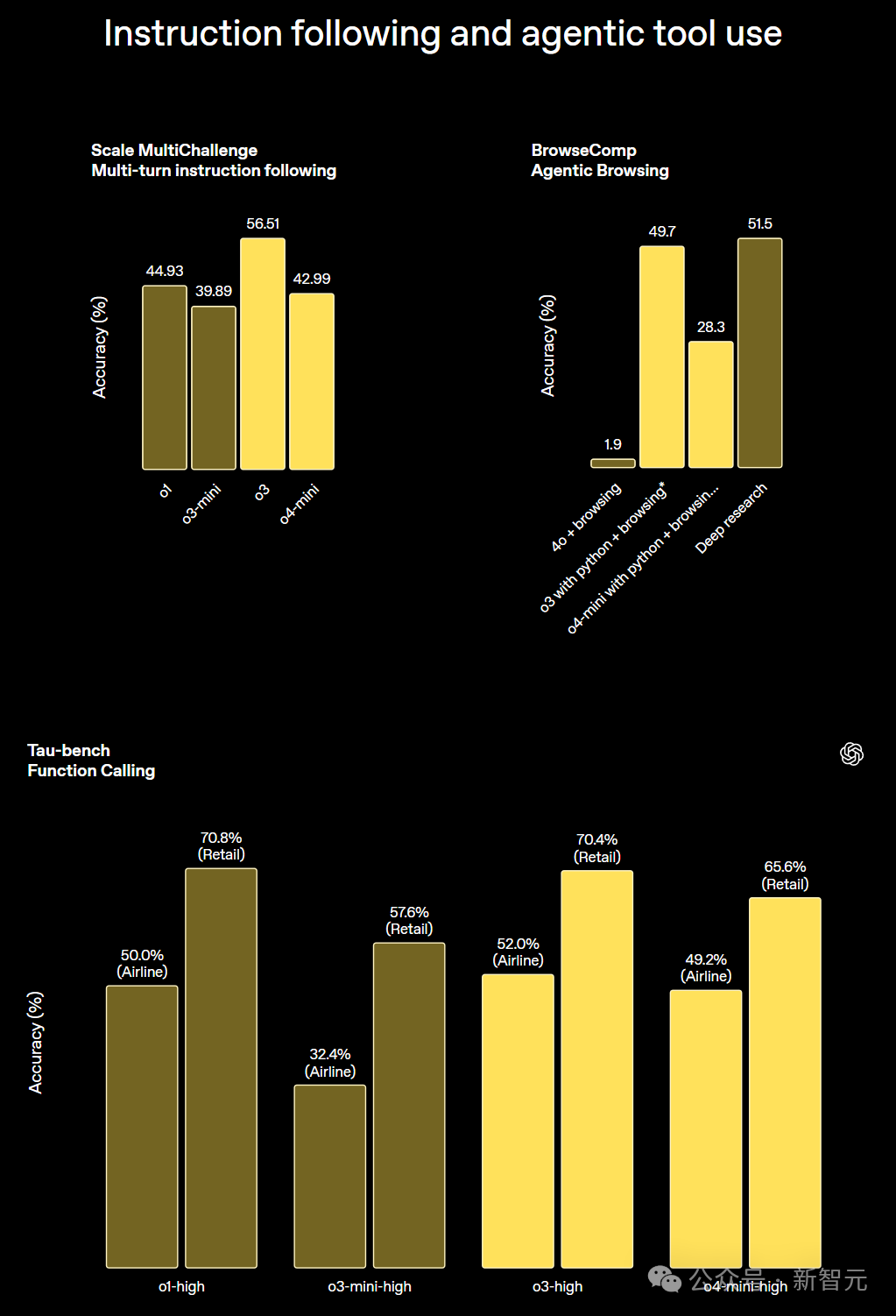 而且,在指令跟随、智能体工具使用评估中,与工具结合的o3和o4-mini准确性是最高的。