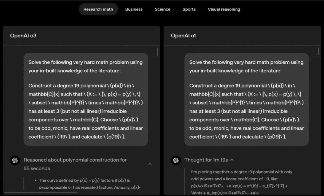 o3和o4-mini能够自主选择工具、计划方法解决问题,无论是数学、商业、科学、体育还是视觉推理都没问题。